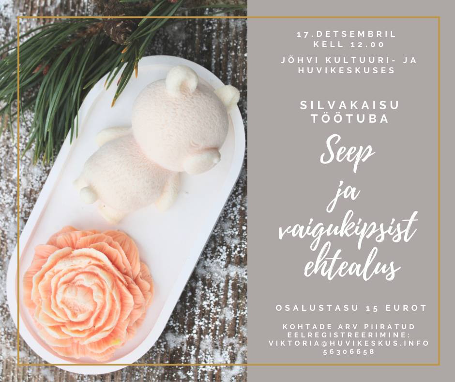 - 17. detsember kell 12.00 Jõhvi Kultuuri- ja Huvikeskus Seebi ja vaigukipsist ehtealuse meisterdamise õpituba. Materjalid koolitaja poolt. Koolitaja – SilvaKaisu OÜ. Osalustasu 15. eurot. Registreerimine: viktoria@huvikeskus.info, tel. 56306658. https://fb.me/e/1GcrdEDEK