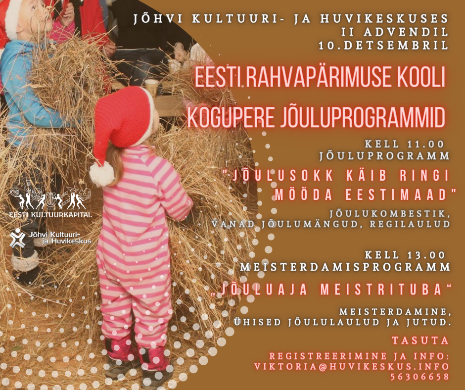 - Eesti Rahvapärimuse Kool esitleb: Kogupere jõulukombestike tutvustavad programmid 10. detsembril Jõhvi Kultuuri- ja Huvikeskuses. Kell 11:00-12:30 Jõuluprogramm “JÕULUSOKK KÄIB RINGI MÖÖDA EESTIMAAD”. Lustakas, vanade jõulumängude ja regilauludega kombestikuprogramm, kus kohal päris jõulusokk. Programm toimub vastavalt osalejate eale. Kell 13:00-14:30 Jõulukombestiku meisterdamisprogramm „JÕULUAJA MEISTRITUBA“. Mõnus heintel istumine, heintest, lõngast, ubadest meisterdamine. Valmis saame põnevad kingsepad, millega mängida kingsepamängu, lisaks teeme passid, jõulurebased, tärnid. Meisterdamise ajal ühised jõululaulud ja jutud. Pärimuslikud jõuluprogrammidel osalemine on tasuta. Registreerimine: viktoria@huvikeskus.info, tel 56306658