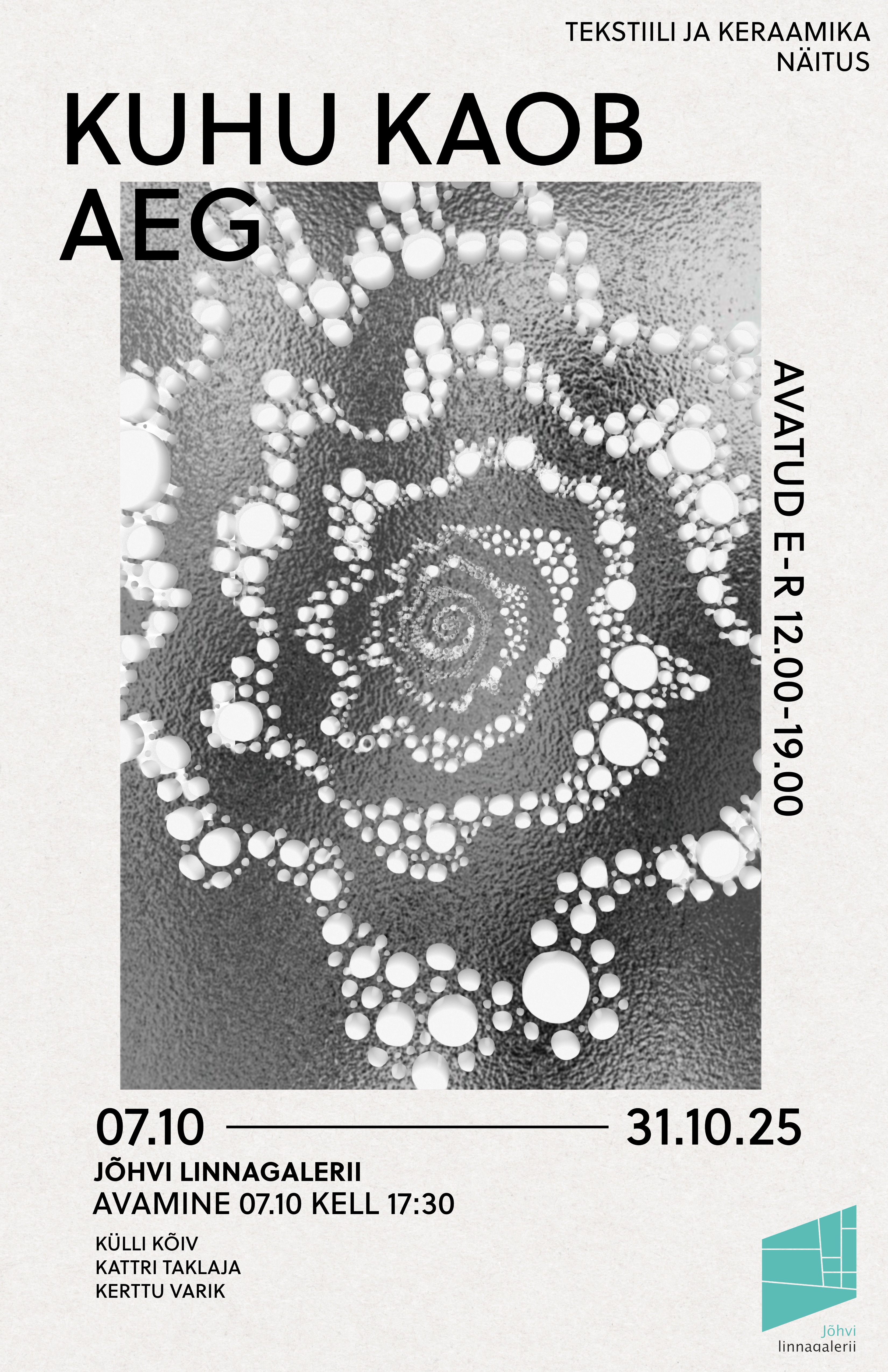 Jõhvi linnagaleriis eksponeerivad Eesti Keraamikute Liidu liikmed Külli Kõiv, Kattri Taklaja ja Eesti Tekstiilikunstnike Liidu liige Kerttu Varik keraamika ning tekstiilide näitust “Kuhu kaob aeg”.