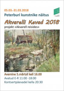Jõhvi linnagaleriis saab vaadata 5.märtsist Sankt-Peterburgi Akvarelliseltsi kaheteistkümne kunstniku – Marina Busareva, Natalja German, Anželika Kalinina, Veronika Leontjeva, Zinaida Revtšuk, Anna Tereštšenkova, Faizulla Aminov, Alla Tšebõševa, Juri Štševtšuk, Vladimir Mišurov, Lev Dutov, Sergei Temerev projektinäitust „Akvarell reisides“.