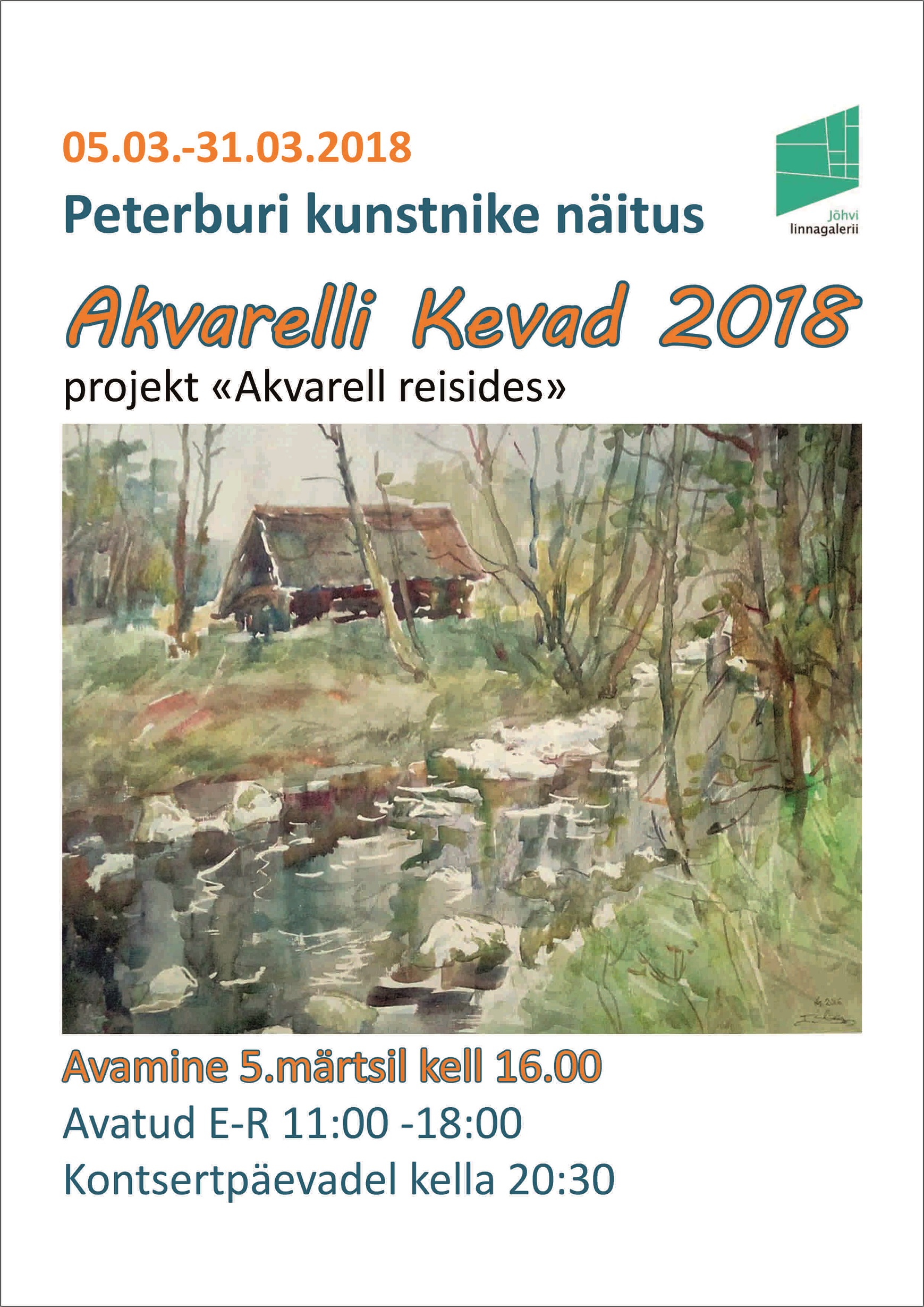 Jõhvi linnagaleriis saab vaadata 5.märtsist Sankt-Peterburgi Akvarelliseltsi kaheteistkümne kunstniku – Marina Busareva, Natalja German, Anželika Kalinina, Veronika Leontjeva, Zinaida Revtšuk, Anna Tereštšenkova, Faizulla Aminov, Alla Tšebõševa, Juri Štševtšuk, Vladimir Mišurov, Lev Dutov, Sergei Temerev projektinäitust „Akvarell reisides“.